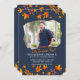 Una impresionante invitación con foto con fondo azul marino con hojas doradas y naranjas que caen. La ventana de la foto tiene una forma poligonal única. (<a href="https://www.freepik.com/free-photo/content-handsome-traveler-sitting-on-flowerbed_1147786.htm">Diseñado por Katemangostar</a>). (<a href='https://www.freepik.com/free-vector/stylish-autumn-sale-background-with-falling-leaves_2749447.htm'>Diseñado por Starline</a>). <br/><br/>La tarjeta es fácil de personalizar con su texto, fuente y color de fuente.<br/><br/>¿No es exactamente lo que estás buscando? Todos nuestros productos pueden ser diseñados a medida para satisfacer sus necesidades sin cargo adicional.<br/><br/>Simplemente contáctenos en askcottonlamb@gmail.com.<br/><br/>Productos coordinados disponibles: ¡Solo pregúntenos!