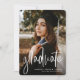 Celebra tu graduado de secundaria o universitario con esta invitación vertical de graduación de una foto. La escritura moderna "graduada" en el frente en blanco es perfecta para un grado de moda. El respaldo es verde oscuro con un patrón sutil, pero el color puede cambiarse a cualquier color escolar haciendo clic en "personalizar".