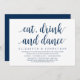 Moderna escritura en tema de azul marino clásico, tarjeta de invitación de fuga de boda (Comer, beber y bailar). Es perfecto para su cena de boda casual junto al lago, baile y fiesta de fuga de boda.