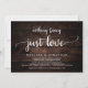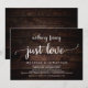 Hermosa celebración de fiesta de nada elegante, solo amor, Anuncio de fuga de novios / Tarjeta de invitación, en diseño de madera rústica oscura de granja marrón. Esto es perfecto para su recepción de boda y fiesta de celebración después de la boda. Agregue sus detalles en la fuente / letra coincidente.