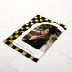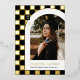Esta moderna y única invitación de graduación tiene un Relieve metalizado de oro real y un fondo de cuadros negros que destaca una fotografía del graduado enmarcado en un arco blanco con el nombre del graduado y la escuela debajo. Con el año de graduación se muestra astutamente un pequeño límite de graduación en el fondo comprobado. La parte trasera tiene un divertido patrón a juego marcado en blanco y negro.