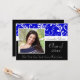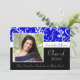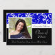Invitaciones de graduación con foto y diseño azul, negro y blanco con flores y vides giratorias. Cuidada, moda, delicada y femenina para cualquier chica o graduada. Muestra tu estilo personal con esta hermosa invitación de foto grad. Excelente como invitación de graduación o invitación a fiesta de graduación.