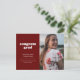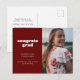 Anuncia el gran logro de tu graduado con esta simple pero elegante invitación de graduación. Cuenta con las palabras "congrats grad" en una fuente retro blanca sobre un fondo rojo oscuro, así como espacio para una foto en la parte frontal. Utiliza el reverso de la postal para los detalles sobre la celebración para tu graduado.