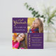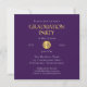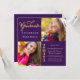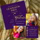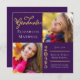 Elegante y elegante color púrpura cuadrado y dorado, dos invitaciones de graduación de fotos y diseño de invitación a fiestas. Presenta la palabra "Graduado" en el arte de texto en tonos dorados guionados y el año "2022" en el arte de texto en tonos dorados verticales en el frente con tus fotos en esquinas opuestas. Los campos se proporcionan para el nombre del graduado, la fecha de graduación, la escuela, la universidad o la universidad y los planes futuros al frente. En la parte trasera hay un diseño coordinado de la invitación a la fiesta de graduación, también con acentos en tonos dorados. Diseño por diseños de Holiday Hearts (derechos reservados).