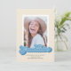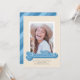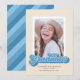 Esta divertida invitación de graduación fotográfica única presenta la palabra graduada escrita en un guión de estilo retro en tonos azules. La parte posterior de la tarjeta tiene un patrón de rayas diagonales de coordinación de color.
