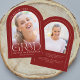 Esta sencilla invitación roja de graduación en arco minimalista presenta un delicado marco en arco, 2 plantillas de fotos y una elegante tipografía moderna.