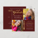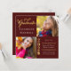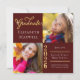 Elegante y elegante marrón cuadrado y dorado, dos invitaciones de graduación de fotos y diseño de invitación a fiesta. Presenta la palabra "Graduado" en el arte de texto en tonos dorados guionados y el año "2025" en el arte de texto en tonos dorados verticales en el frente con tus fotos en esquinas opuestas. Los campos se proporcionan para el nombre del graduado, la fecha de graduación, la escuela, la universidad o la universidad y los planes futuros al frente. En la parte trasera hay un diseño coordinado de la invitación a la fiesta de graduación, también con acentos en tonos dorados. Diseño por diseños de Holiday Hearts (derechos reservados).