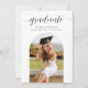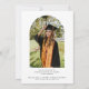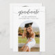 Una invitación de graduación minimalista diseñada con dos fotos personalizadas en forma de arco y una elegante letra de "graduado" con un clásico estilo de letra. Personaliza los detalles de la fiesta en la parte trasera.