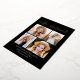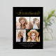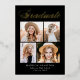 Elegante invitación de graduación con "Graduado" mostrado en la parte superior en un guión de caligrafía de Relieve metalizado dorado con fondo negro (o color de su elección). El diseño muestra cuatro fotos del graduado mostradas en un diseño de estilo collage con el nombre del graduado, el nombre de la escuela y el año de graduación que se muestra a continuación. La invitación de graduación de 4 fotos se revierte para mostrar texto opcional como planes futuros, detalles de la fiesta de graduación, etc. La invitación de graduación de la moda es perfecta para anunciar la graduación tanto de los graduados de la escuela secundaria como universitarios.