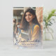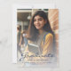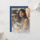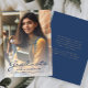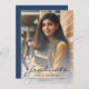 Moderna invitación de graduación con una foto vertical personalizado. La palabra "Graduado" aparece en la escritura azul marino, con el nombre del graduado, la escuela y el año de graduación debajo en letra sans serif. Reemplace fácilmente la imagen de muestra con la foto de su propio graduado. Una pantalla de degradado blanco ayuda a asegurar que aparece el texto. Añade detalles sobre los logros de tu graduado y planes futuros al revés en un texto de color dorado sobre un sólido fondo azul marino. Ideal para graduación de secundaria o universitaria.