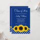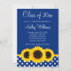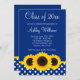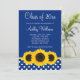 Hermosos girasoles amarillos con un patrón de puntos polka azul y blanco aparecen en la invitación a graduarse con temática de este país. Perfecto para una graduación de secundaria, una graduación universitaria o una invitación a una fiesta de graduación.