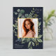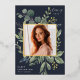 Nuestra invitación de graduación Eucalyptus & Sage enmarca una foto de tu graduado con un elegante borde cuadrado de eucalipto de acuarela exuberante y hojas verdes de salvia, con un verdadero guarnecido de Relieve metalizado dorado en un fondo azul marino de medianoche. Personalice el curso, el nombre y la escuela de su graduado. Añade un mensaje personal a la parte posterior, junto con una foto adicional.