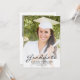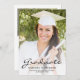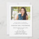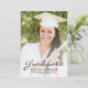 Moderna invitación de graduación con una foto vertical personalizado en el frente y una foto horizontal en el reverso. La palabra "Graduado" aparece en escritura negra, con el nombre del graduado, la escuela y el año de graduación debajo en letra sans serif. Personalice el reverso con detalles sobre la graduación y los planes futuros del graduado en texto negro sobre fondo blanco. Reemplace fácilmente las imágenes de muestra con fotos de su propio graduado. Una pantalla de degradado blanco ayuda a asegurar que el texto de la parte delantera de la tarjeta aparezca. Ideal para graduación de secundaria o universitaria.