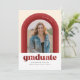 Esta divertida invitación de graduación presenta un arco con diferentes tonos de rojo alrededor de una sola foto. La parte posterior de la tarjeta tiene un patrón de franja de coordinación así como espacio para un mensaje personal o detalles de invitación para una celebración de graduación.