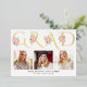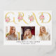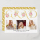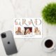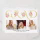 invitación de graduación fotográfica de tipografía GRAD de Relieve metalizado dorado. Presenta la palabra "GRAD" en una fuente decorativa de Relieve metalizado dorado, ramos de rosas rosas rosas y tres fotos. El reverso presenta un patrón de límites blancos de graduación en oro.