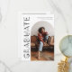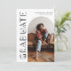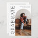 Elegante y moderna tarjeta de invitación de graduación para enviar a familia y amigos. Hay un arco blanco alrededor de tu foto. Puede agregar una segunda imagen en la parte posterior y el mensaje es editable. Dice "graduado" en el lado de la tarjeta en letras de tipografía celestial y boho.