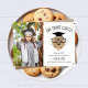 "Una galleta inteligente" tema preescolar / jardín de infancia / graduación de la escuela primaria que presenta el ilustracion de una galleta con una gorra de graduación y gafas con un vaso de leche rodeado de confeti. Personalice la foto a la izquierda.