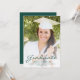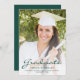 Moderna invitación de graduación con una foto vertical personalizado. La palabra "Graduado" aparece en un guión de color verde oscuro, con el nombre del graduado, la escuela y el año de graduación debajo en letra sans serif. Reemplace fácilmente la imagen de muestra con la foto de su propio graduado. Una pantalla de degradado blanco ayuda a asegurar que aparece el texto. Añade detalles sobre los logros de tu graduado y los planes futuros sobre el reverso en texto blanco sobre un sólido fondo verde oscuro. Ideal para graduación de secundaria o universitaria.