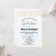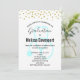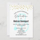 Una invitación para una celebración de graduación de enfermería. Diseñada con puntos de confeti dorado falso a lo largo de la parte superior. Un estetoscopio azul pastel detrás del texto de la fiesta. Diseño minimalista simple.