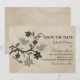 Anuncio dulce y caprichoso de Guardar la Fecha de Pájaros de Amor Florales con una cascada de flores en una vid floral en espiral y una pareja de pájaros de amor grises con un aspecto vintage con fondo de arte digital texturizado en beige. Esta encantadora invitación de guardar la fecha es perfecta para anunciar su boda de primavera o verano. Fácil de personalizar, simplemente agregue los detalles de su boda. Haga clic en "Personalizar" para encontrar más opciones de personalización.