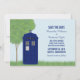 Anuncio de Guardar la Fecha Police Box extravagante y divertido que presenta una brillante caja de policía vintage azul en un campo bonito con un árbol en el fondo. Fácil de personalizar, simplemente agregue los detalles de su boda en los campos de texto proporcionados. Haga clic en "Personalizar" para encontrar más opciones de personalización.
