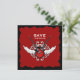 Anuncia tu boda con esta invitación de guardar la fecha poco convencional al estilo rock and roll con guitarras eléctricas de rock cruzadas, alas y ornamentos vintage en rojo y negro.