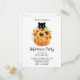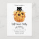 Una linda tarjeta postal de invitación a una fiesta de Halloween de una gata negra escondiéndose detrás de una calabaza de girasol pintada con acuarela para niños. Linda pero no demasiado aterradora, con una fuente de estilo escrito a mano peculiar.