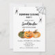 Agradable y espeluznante invitación de Halloween a la fiesta de tallado de calabaza con calabazas acuáticas y arañas gateando sobre fondo blanco.