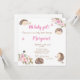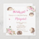 Adorable invitación de Baby Shower para una bebé con erizos dulces, mariposas, abejas y flores rosadas. En la parte delantera de la invitación se muestra la información de la ducha mientras que en la parte posterior se muestra el registro de la futura mamá.
