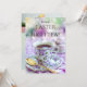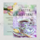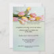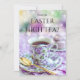 Invitación de cumpleaños al estilo británico o Brunch de Pascua o High Tea con un té colorido en la parte frontal y elegantes flores de tulipán primaveral en la parte trasera