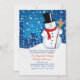 Un muñeco de nieve sonriente con un paisaje urbano nevado le invita a una celebración de invierno. ¡Únete a la diversión! Perfecto para fiestas de vacaciones, cumpleaños y más.