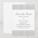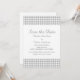 Anuncio de Houndstooth para guardar la fecha simple pero elegante con un fondo de patrón de cuadros grises y blancos de moda. Fácil de personalizar con los detalles de su boda. Para más opciones de personalización, haga clic en el botón Personalizar