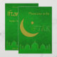 Tarjeta de invitación de fiesta de Iftar elegante con silueta de mezquita, luna y estrella en verde y dorado.