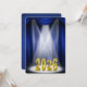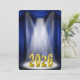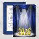 Invitación a la ceremonia de graduación para la clase de 2026 en azul y dorado en el escenario con reflectores.