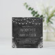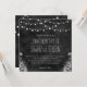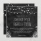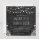String de Lights Chalkboard © Sunny Mars Designs. Elegante, moderno, elegante, elegante, de moda, personalizable de moda formal o encantadoras invitaciones de boda casuales de 5.25" x 5.25" con un hermoso diseño de pizarra negra con bombillas de cuerda o cuerda colgadas encima con un diseño tropical floral debajo.
