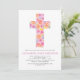 Flores de color rosa pastel, Naranja y morado cruzan acuarela botánica invitaciones cristianas de bautismo religioso.