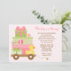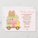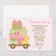 Esta invitación linda de Baby Shower ofrece regalos rosados y verdes del bebé y un caucho ducky en un carro. Esta invitación moderna y de la diversión de la fiesta de bienvenida al bebé es perfecta para que cualquier mamá sea.