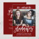 Invitación/invitación de una fiesta de graduación a la moda para los BFF, hermanos, primos, familiares, graduados de barrio u otras ocasiones de varios grados, esta invitación tiene los nombres de los graduados, año de clase y colegio al frente de la invitación, junto con una foto de muestra que se reemplaza con la que se desea. La parte posterior de la invitación tiene una plantilla de texto para los detalles de la celebración de la fiesta de graduación. La combinación de colores es marsala roja con texto blanco.