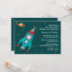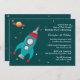 ¡La fiesta del cumpleaños de este muchacho lindo invita tiene fuera de este tema del espacio del mundo! El fondo tiene un color verde azulado oscuro con las porciones de estrellas amarillas, blancas, y del gris en el fondo. Hay una nave espacial que vuela diseñada retra en la izquierda con un planeta anaranjado y rojo con los anillos en la esquina izquierda superior. A la derecha, usted puede modificar fácilmente su información del fiesta para requisitos particulares. En la parte trasera, hay astronauta que flota en espacio.