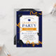 Esta invitación a la fiesta de graduación incluye a gorras negros de color azul con borlos y cintas naranjas, y un fondo azul detallado. Personaliza tu propia imagen y texto.