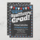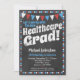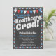 Una divertida y única invitación para una fiesta de graduación de la salud al estilo de la pizarra con banderas rojas, blancas y azules y un maravilloso borde de polka-puntos con puntos en la parte trasera.