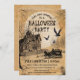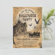 Creíble y vintage invitación a la fiesta de Halloween con una casa embrujada, un carro tirado por caballos de un emprendedor y cuervos enfurecidos sobre un fondo de papel antiguo. Por favor, vea mi tienda para más productos aterradores. Ideal para: gótico, vintage, steampunk, antigüedades, victoriano, Día de los Muertos, fiestas de disfraces.