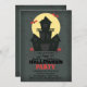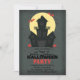 Eerie Haunted House Party Invitation incluye una casa inquietante con murciélagos rojos y linternas contra una luna amarillo pálido.