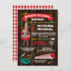 Fiesta barbacoa en el patio trasero de Honey do BBQ. Presenta una parrilla retro, utensilios y una tipografía divertida sobre un fondo rústico de madera oscura. La parte de atrás está con y de gingham roja. ¡Ideal para una fiesta de compromiso de verano, ducha!