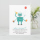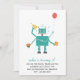 Invitación de la fiesta del cumpleaños del robot de un niño del tema que ofrece un globo, una magdalena, y un gorra del fiesta.