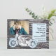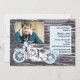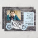 Una invitación masculina para el entusiasta de la motocicleta. Las características del diseño un fondo apenado blanco y negro con un ciclo azul y blanco, su foto y un panel azul para sus sentimientos. Perfeccione para cualquier varón de la edad.