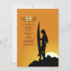 Fije la escena por un día de la diversión de diversión de la playa con esta invitación perfecta para su entusiasta del persona que practica surf-chica. Ofrece una salida del sol de oro con una silueta del chica y de la tabla hawaiana. La tarjeta es fácil de modificar para requisitos particulares con su fraseología, fuente, color de la fuente y opción de seis tipos de papel.