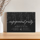 Nuestras elegantes invitaciones a la fiesta de compromiso en moda en blanco y negro cuentan con un rico fondo negro con cuerdas de luces blancas en la parte superior, y "fiesta de compromiso" en la tipografía de guiones de caligrafía de moda. Personalice con sus detalles de celebración de compromiso debajo de las letras blancas.