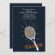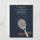Un unisex, adulto, invitación del deporte para la celebración del cumpleaños de un entusiasta del tenis. El fondo del negro ofrece una estafa de tenis blanca que demuestra cómo maximizar la velocidad de un servicio.