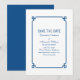 Anuncio simple y minimalista de Deco Chic para Guardar la Fecha con un borde ornamental moderno de estilo art déco en azul oscuro. Esta invitación clásica y elegante para guardar la fecha es fácil de personalizar con los detalles de su boda. Encuentre más opciones de personalización haciendo clic en Personalizar.